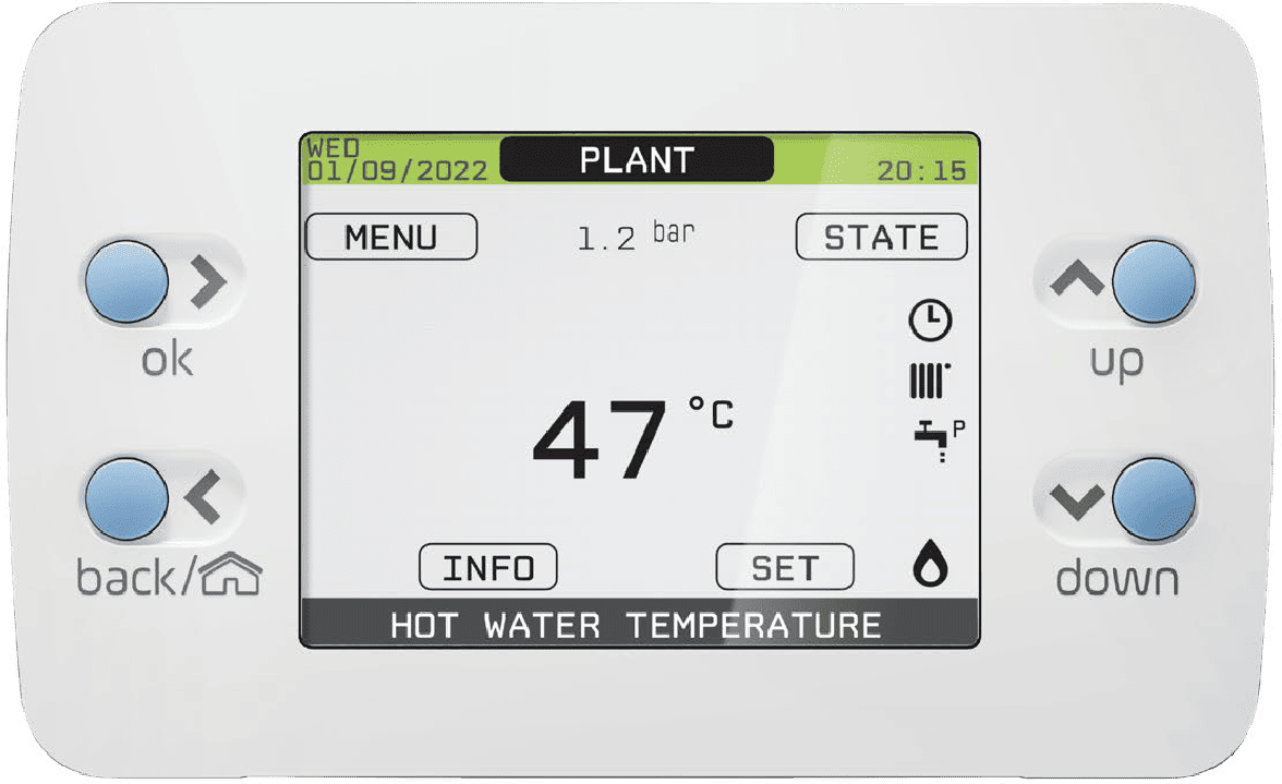 L’interfaccia è dotata di un ampio display a cristalli liquidi retroilluminato a colori, e di quattro tasti che ne semplificano l’utilizzo. Il pannello visualizza e gestisce anche le funzionalità di controllo multizona e di cronotermostato ambiente.