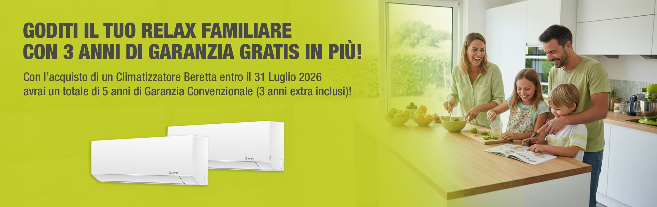 * Per ogni acquisto di climatizzatori Beretta, effettuato a partire dal 1° febbraio al 31 luglio 2026 e registrato sul nostro portale myeasycomfort.com, entro la scadenza della promozione, sarà possibile ottenere gratuitamente un prolungamento della garanzia convenzionale di ulteriori 3 anni rispetto alla garanzia convenzionale Beretta di 2 anni**. Il prolungamento della garanzia convenzionale riguarda tutte le gamme di Climatizzatori Residenziali.