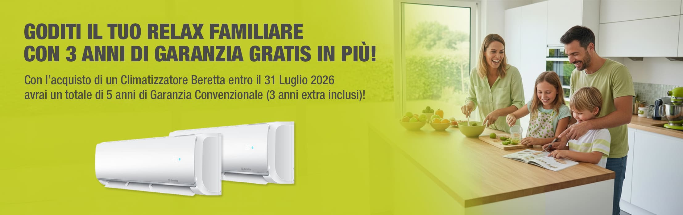 * Per ogni acquisto di climatizzatori Beretta, effettuato a partire dal 1° febbraio al 31 luglio 2026 e registrato sul nostro portale myeasycomfort.com, entro la scadenza della promozione, sarà possibile ottenere gratuitamente un prolungamento della garanzia convenzionale di ulteriori 3 anni rispetto alla garanzia convenzionale Beretta di 2 anni**.  Il prolungamento della garanzia convenzionale riguarda tutte le gamme di Climatizzatori Residenziali.